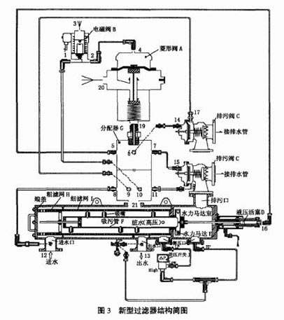 圖2全自動自清洗式過濾器外形圖新過濾器的型號為AF-816,工作壓力為2.5MPa,過濾精度3mm,設(shè)計流量2500m3/h,其結(jié)構(gòu)簡圖見圖3所示。 新型過濾器的工作過程臟水從過濾器的進(jìn)口[12]流入,并從外向內(nèi)流過粗濾網(wǎng)[H](粗濾網(wǎng)的作用是攔截一些比較大的雜質(zhì),保護(hù)細(xì)濾網(wǎng))后,進(jìn)入細(xì)濾網(wǎng)[I]。水通過細(xì)濾網(wǎng)由內(nèi)向外流出時,雜質(zhì)積累在濾網(wǎng)內(nèi)表面并形成“濾餅”,這將產(chǎn)生一定的水頭損失,當(dāng)細(xì)濾網(wǎng)內(nèi)外的壓差達(dá)到預(yù)設(shè)值(0.5bar,7psi)時,過濾器開始啟動一次自動清洗過程。濾網(wǎng)內(nèi)的清洗裝置即吸吮清掃器進(jìn)行螺旋式的吸吮運(yùn)動將濾網(wǎng)上的雜質(zhì)吸走,并經(jīng)過排污管排出,潔凈水流出過濾器出口[13]。整個清洗過程耗時約為8~15s,依據(jù)實際的壓力而定,清洗時系統(tǒng)不斷流。 自動清污工作原理: (1)緩慢打開過濾器的進(jìn)水和出水閥門,確認(rèn)工作壓力沒有異常。 (2)過濾器自動運(yùn)行時,水由進(jìn)水口[12]進(jìn)入,首先經(jīng)過粗濾網(wǎng)[H]過濾掉較大顆粒的雜質(zhì),然后到達(dá)細(xì)濾網(wǎng)[I],再從出水口[13]流出。在過濾過程中,細(xì)濾網(wǎng)[I]逐漸累積水中的臟物、雜質(zhì),形成過濾雜質(zhì)層,由于雜質(zhì)層堆積在細(xì)濾網(wǎng)[I]的內(nèi)側(cè),因此在細(xì)濾網(wǎng)[I]的內(nèi)、外兩側(cè)就形成了一個壓差。 (3)當(dāng)這個壓差[△P]達(dá)到預(yù)設(shè)值時,壓差開關(guān)[J]接點(diǎn)動作使電磁閥[B]動作,將開始自動清洗過程,此間不斷流:菱形閥[A]的上部控制腔接口[4]通過電磁閥[B]的[2-1]接口接壓力水,使菱形閥[A]的接口[19]與排水口[20]連通,排污閥[C]的上腔接口[14]和[15]通過分配器[G]的接口[6、7]接菱形閥的接口[19-20]而排水,排污閥[C]隔膜下部接口[17]和[18]通過分配器的接口[9、11]接壓力水,排污閥打開;液壓活塞[D]的控制接口[16]通過分配器[G]的接口[5]釋放壓力并將水從菱形閥[A]的接口[20]排出,液壓活塞[D]向右運(yùn)動;由于排污閥[C]打開,因此水力馬達(dá)室及吸污管[F]內(nèi)的壓力大幅度下降,由此通過吸嘴及水力馬達(dá)室外端產(chǎn)生一個吸污過程。當(dāng)水流經(jīng)水力馬達(dá)[E]時,帶動吸污管[F]進(jìn)行軸向運(yùn)動并旋轉(zhuǎn),逐漸將污水排出。軸向運(yùn)動與旋轉(zhuǎn)運(yùn)動的結(jié)合可將整個濾網(wǎng)內(nèi)表面完全清洗干凈。 (4)整個沖洗過程只需8~15s,細(xì)濾網(wǎng)[I]沖洗干凈后,濾網(wǎng)內(nèi)外壓差降低,壓差開關(guān)[J]接點(diǎn)動作,控制電磁閥[B]斷電失磁,菱形閥[A]的接口[19-20]關(guān)閉,則排污閥[C]上腔通過[14、15]進(jìn)水,排污閥[C]關(guān)閉,由進(jìn)水口[12、21]補(bǔ)充的水壓會使液壓活塞[D]回到其初始位置,過濾器開始準(zhǔn)備下一個沖洗周期。過濾后的凈水由出水口[13]流出。 手動清污工作原理 用一字螺絲刀將電磁閥[B]黃銅閥座上的螺釘順時針或逆時針旋轉(zhuǎn)90°,系統(tǒng)按照上述自動清污的過程進(jìn)行反清洗。 新型自清洗過濾器特點(diǎn): 原理簡單利用網(wǎng)孔將顆粒物截留在濾網(wǎng)的內(nèi)表面。濾網(wǎng)采用特殊的編織工藝,最高過濾精度可達(dá)到15μm,目前國產(chǎn)的只能達(dá)到200μm以上的精度,該新型過濾器的有效過濾面積是國外同等品牌的2~3倍,是國產(chǎn)的5倍以上。其巧妙的設(shè)計,用很小的吸嘴產(chǎn)生較強(qiáng)吸力。 結(jié)構(gòu)簡單: 一個本體、一套濾網(wǎng)、一套清洗機(jī)構(gòu)、一套水力控制系統(tǒng)組成一個全自動過濾器,處理水量大,安裝占地面積小。 維護(hù) 便捷本體和端蓋使用螺栓連接,設(shè)備需要維護(hù)時,只要2個人在很短時間內(nèi)就可以將其打開,打開后只要將濾網(wǎng)抽出沖洗或更換就可以。 節(jié)能 因為過濾器采用220 VAC電磁閥外加水力控制及水力驅(qū)動,電能消耗少,反清洗耗水量低(小于過濾水量的1%),而且在反清洗時不斷流。 耐用 過濾器本體采用的是37-2碳鋼,外表面經(jīng)噴砂及磷化處理,外涂5層環(huán)氧樹脂烤漆,漆膜厚度為200~220μm,超強(qiáng)耐腐蝕。內(nèi)表面經(jīng)噴砂及磷化處理,先涂布2層環(huán)氧樹脂4230,再涂布1層鉻酸鋅,最后再以氯化橡膠涂布,漆膜厚度為200~220μm,耐腐蝕能力非常強(qiáng)。濾網(wǎng)、吸污管、水力馬達(dá)等部件采用不銹鋼316 L制作,使用壽命長。 新型自清洗過濾器與常規(guī)過濾器比較在水電機(jī)組的技術(shù)供水系統(tǒng)上,國內(nèi)大多數(shù)電站使用的過濾器都是以電機(jī)加減速器驅(qū)動為主,以下就是新型自清洗過濾器和電力控制電力驅(qū)動的過濾器的一些比較,如表1所示。 |